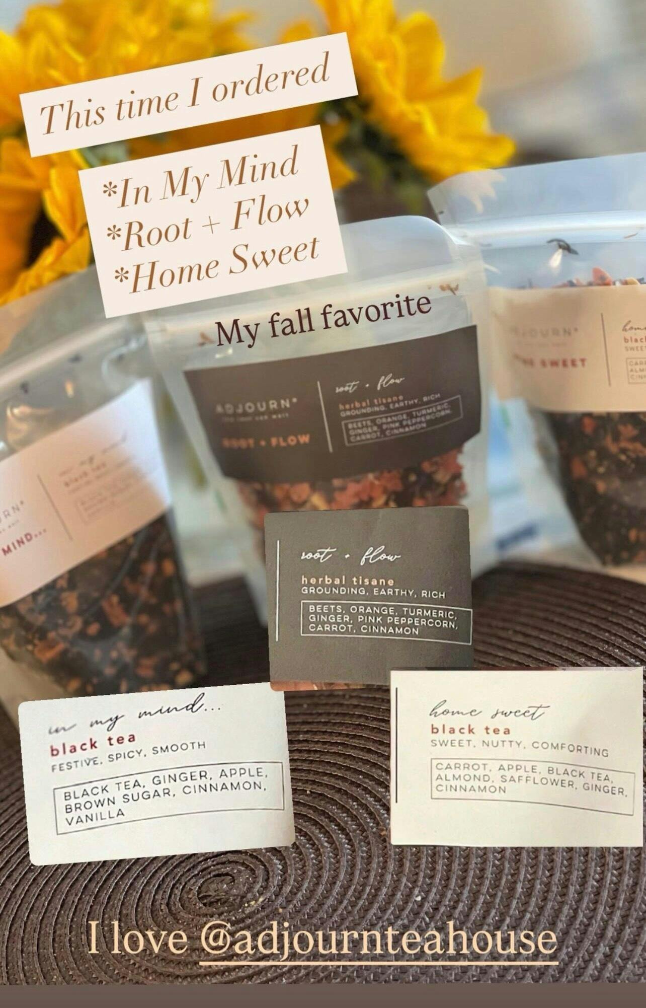 In My Mind – A beautiful black tea with ginger, apple, brown sugar, cinnamon, and vanilla. It’s festive and smooth — like sipping fall coziness with a touch of spice.